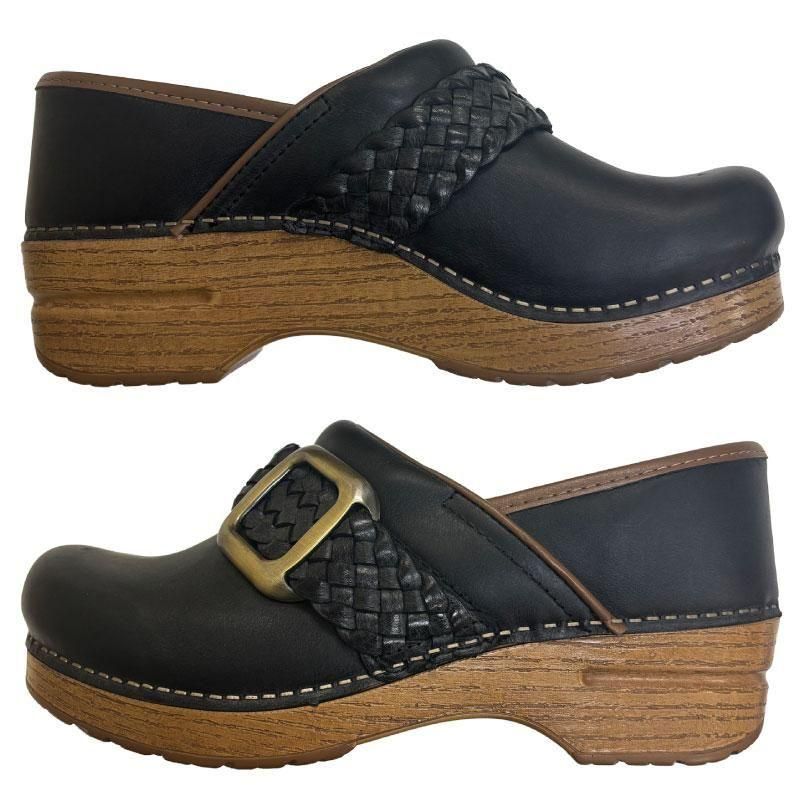 シンプルなクロッグに、上品なブレイディング(編み込み)とアンティーク調の飾りバックルをプラスすることで、大人の女性にも使いやすい落ち着いた華やかさを演出します。